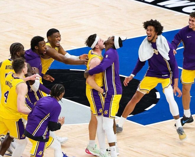 首先,东契奇出战的4场比赛,场均41.3分11.5篮板8.3助攻,一共打了153分钟,拿到165分33助攻,这真是和时间赛跑,还跑赢了!而作为湖人二当家,里夫斯场均31.1分5.1篮板9.3助攻,本赛季最后一节,里夫斯合计投进20球,高居联盟第一!里夫斯只用了7场就达成赛季200分+50助攻的最快队史纪录!当湖人两位超级核心场均轰下72分,湖人变得不可战胜,这也是联盟进攻最强二人组合。数据不说谎,这支湖人具备了冲冠潜质。三个要素,其一,当里夫斯+东契奇+斯马特+八村塁+海斯在场时,湖人百回合赢对手22.9分!