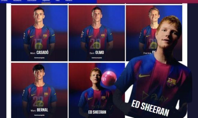 雷速体育10月22日讯 本周末西班牙国家德比前,巴萨官网出现了一位出人意料的“新援”——英国知名歌手埃德·希兰(黄老板)。他被列入了球队一线队名单中,位置为中场。